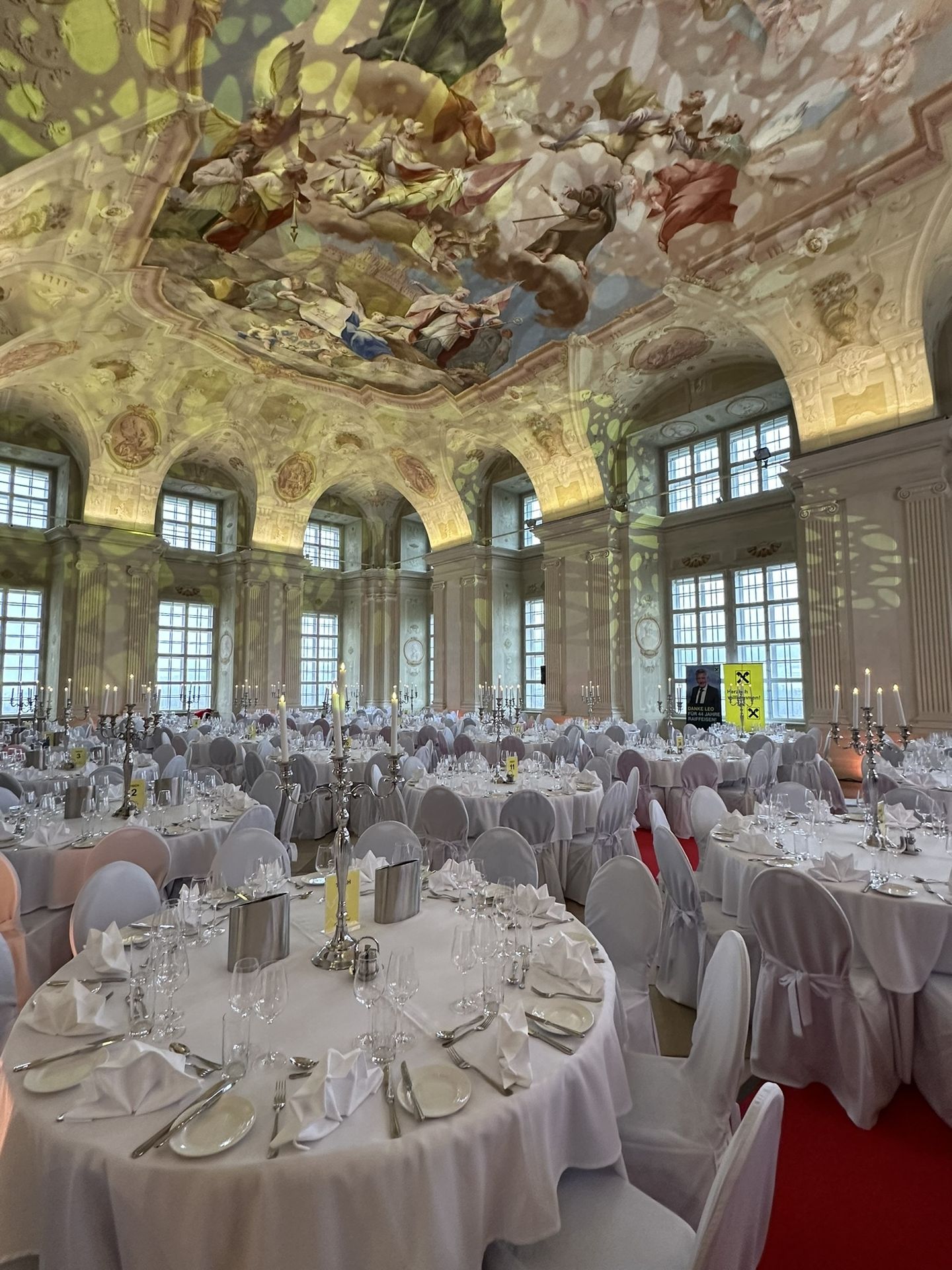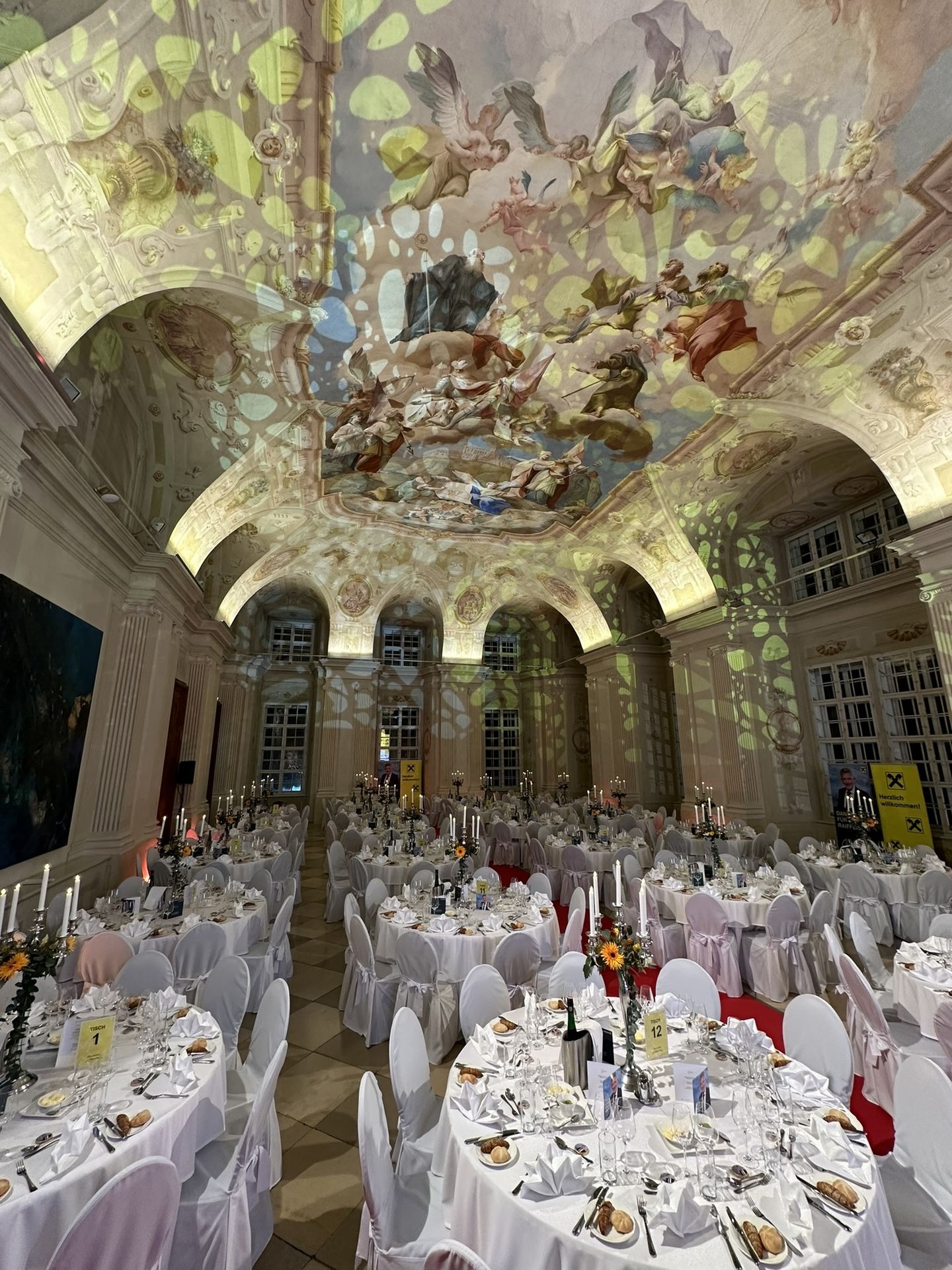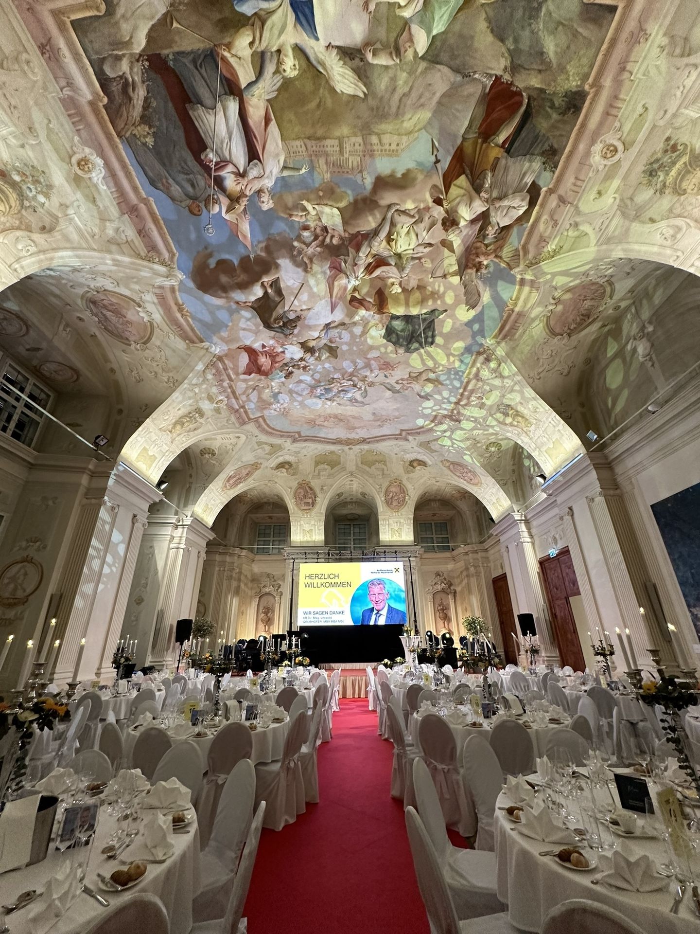 Die Feierlichkeiten fanden im Stift Melk im Kolomanisaal statt, den wir mit wunderschönen Galatischen, pompösen Kronkerzenständern, bester Ton- und Lichttechnik sowie einer LED-Wall ausstatten durften.